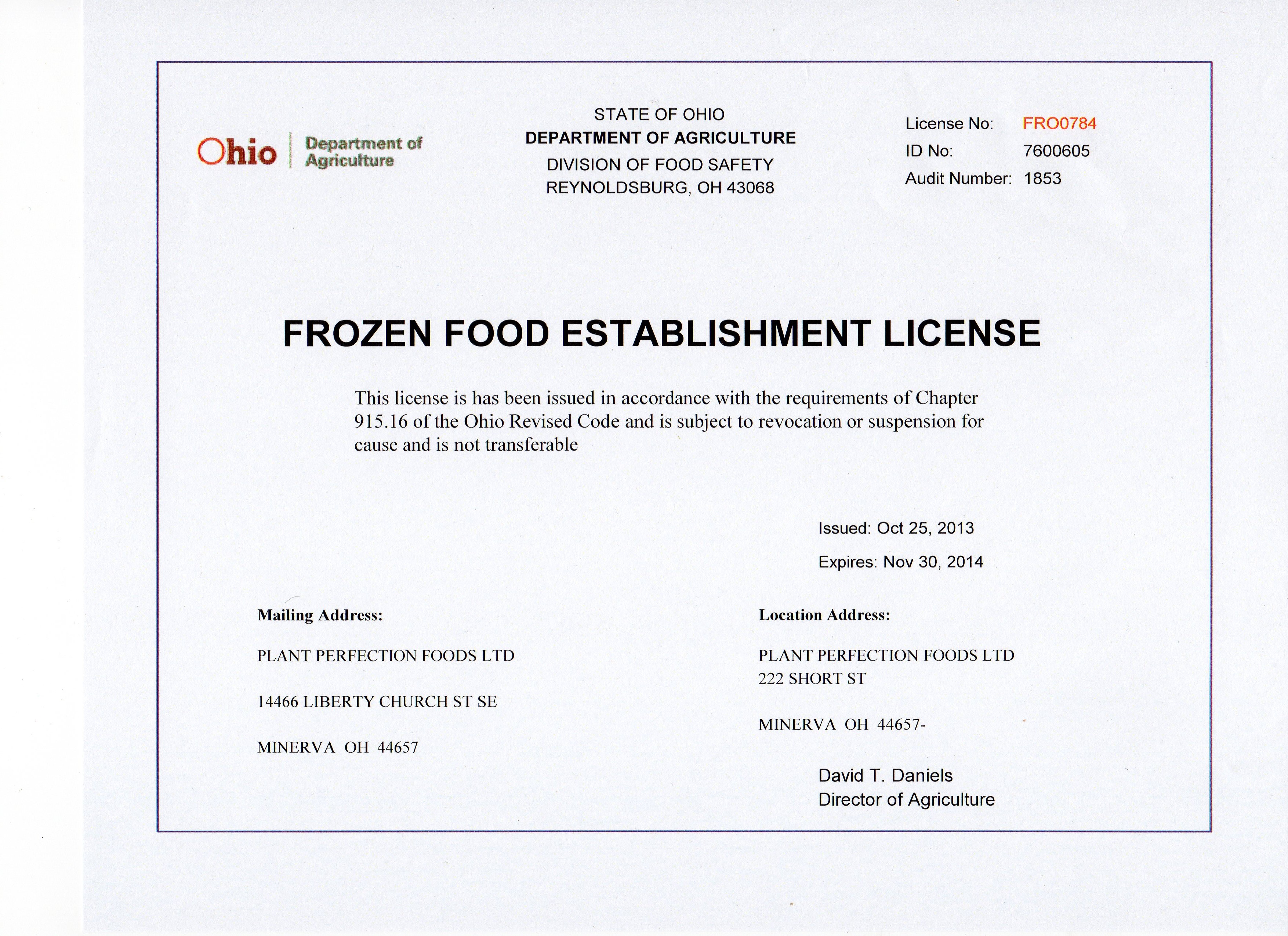 A. Yes, the Ohio Department of Agriculture is our governing authority. We are licensed as a Frozen Food Establishment and abide by the rules established by the FDA for frozen food production.